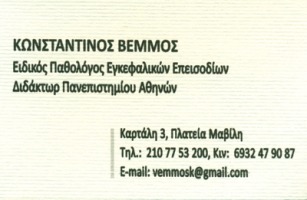 Ο Κωνσταντίνος Ν. Βέμμος είναι Παθολόγος, με εξειδίκευση και αποκλειστικό ενδιαφέρον από το 1989 στην πρόληψη και θεραπεία των Αγγειακών Εγκεφαλικών Επεισοδίων (Stroke Medicine)